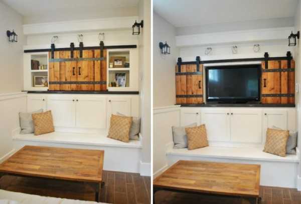 Симпатичное решение спрятать телевизор от посторонних глаз при помощи раздвижных дверей.