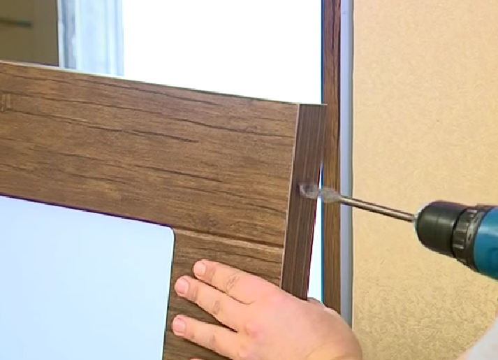 - Далее над дверью нужно закрепить деревянный брус, совмещая его нижний край с намеченной линией и используя уровень. Если линия не горизонтальна, брус следует разместить над самой высокой точкой линии. В этом случае зазор под дверью будет неодинаковой величины.