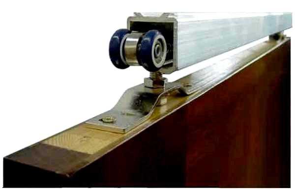 В закрепленную направляющую вставьте ролики. Нижний ролик установите ровно под нижней планкой, чтобы дверь встала вертикально. Нижней штангой может послужить алюминиевый или железный П-образный профиль. Установить и закрепить его на поверхности труда не составит. Далее наденьте дверное полотно снизу на направляющие, после чего вставьте верхние ролики. Когда полотно станет на свое место, установите ограничители вовнутрь резиновым амортизатором. Он помогает двери не выезжать за пределы направляющей планки.