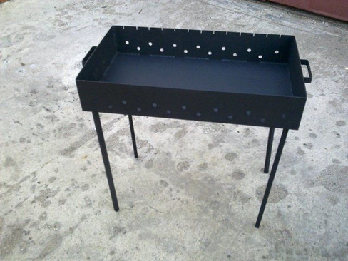 Самый простой мангал – металлический ящик, имеющий отверстия вдоль боковых сторон, обеспечивающие подвод воздуха. Как правило, его устанавливают на приваренные или съемные ножки. При неизменной основной части такая конструкция будет существенно отличаться.