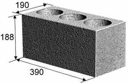 2. Для возведения стен и межкомнатных перегородок используют шлакоблок с двумя или тремя каналами, процент которых не изменяется. Здесь играет роль показатель пустотности, от 28 до 40 %. Блоки с прямоугольными внутренними полостями легко режутся, что удобно при монтаже. В зависимости от того, керамзит или песок выступает в качестве добавочной смеси, в продажу выпускают марки: М75 и М50. Вес пустотелого шлакоблока колеблется в пределах 18-23 кг. Существует два размера: 390х120х188 и 390х90х188. Некоторые блоки изготавливаются с помощью специальных форм, для получения декоративной текстурной поверхности.
