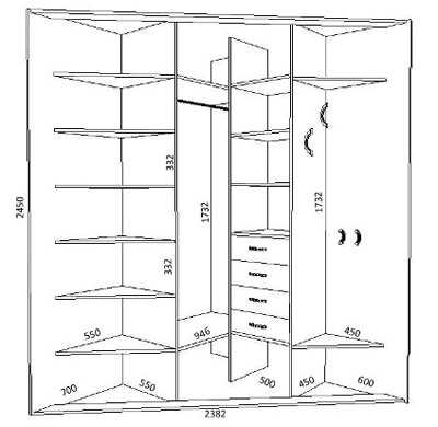 Пример большого, широкого шкафа купе представлены на чертеже: