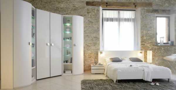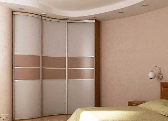 Радиусные шкафы углового типа отличаются более высоким уровнем вместительности ввиду того факта, что двери у такой мебели не плоские, а несколько выпуклые наружу. Дверное полотно двигается в стороны не по прямым направляющим, а по полуокружности, что позволяет придать предмету интерьера неповторимый дизайн. Оценить красоту радиусных конструкций можно на следующем фото.