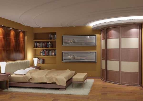 Подобная форма сглаживает углы спальни, но при внушительном количестве полок некоторые из них ограничены в применении. Это обусловлено треугольной формой мебели. Плюс не забывайте про глубину секций, расположенных в углу. От этого доступ к ним бывает несколько осложнен.
