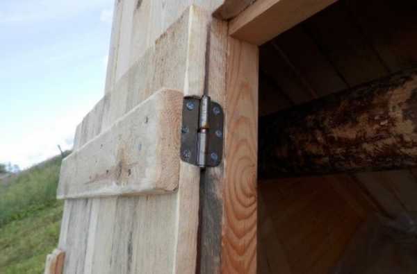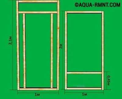 Устройство туалета включает в себя входную дверь. Под неё делается каркас из двух деревянных брусков, а сверху они скрепляются простой планкой.