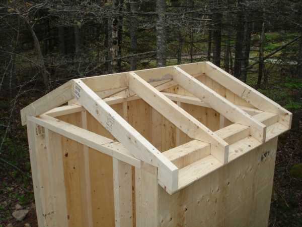 Установка крыши делается только после установки продольных брусьев, которые должны выступать на 0,4-0,5 метра за пределы туалета. Спереди выступ будет оформлен как козырёк, а сзади как слив от осадков.