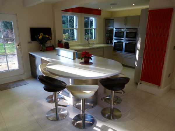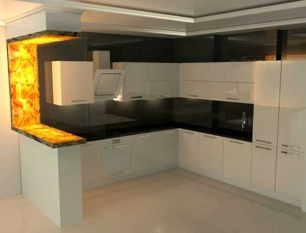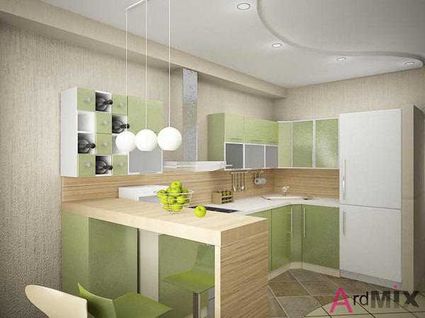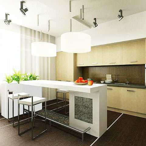 Предназначена для квартир большой площади. В принципе, это может быть и большая квартира студия и кухня, совмещенная с гостиной или столовой. Если это угловая кухня с барной стойкой, то ее дизайн должен строиться таким образом, чтобы стойка стала объединяющим элементом. Проект барной стойки в этом случае выполняется в виде отдельно стоящего острова. При этом, барная стойка может быть отдельным элементом, либо же быть частью рабочей зоны, вынесенной в остров. Она плавно перетекает в рабочую и варочную поверхность. Проект острова может быть П или Г-образным. Сама столешница стойки будет совмещать функции стола для гостей и рабочей зоны для резки продуктов.
