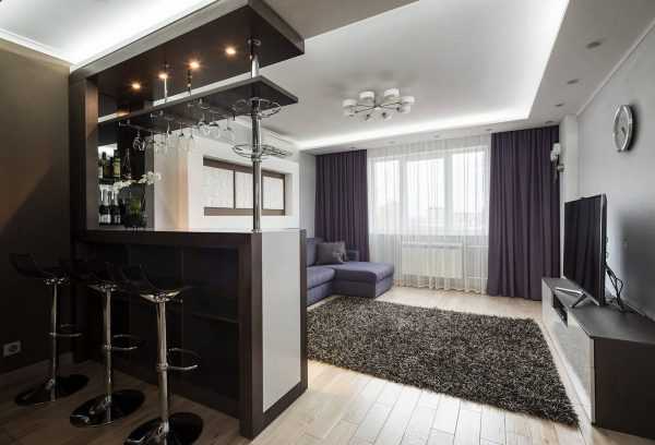 Важно: Студия предполагает, что барная стойка играет роль разделителя – в этом случае лучше всего ориентироваться на многоуровневые стойки со стеллажами. Дизайн кухни с барной стойкой, совмещенной с иными комнатами или проходной, может быть разным, но здесь важно, чтобы стойка была выполнена из тех же материалов и в том же ключе, что и мебель в комнатах.
