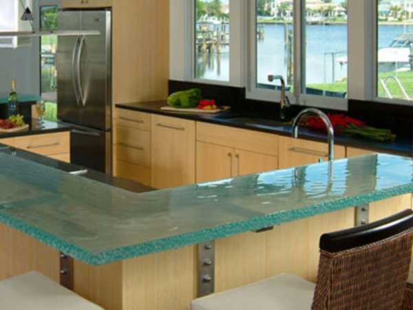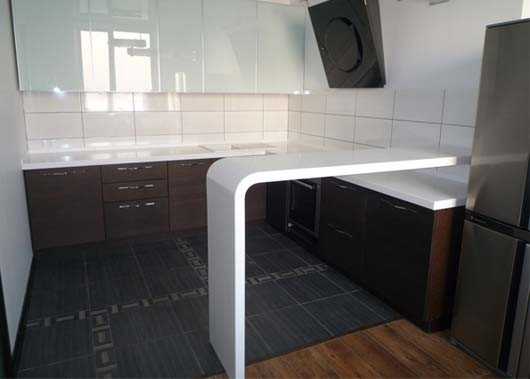 Камень всегда славился привлекательностью и долговечностью. Например, мрамор смотрится красиво, но боится пищевых красителей, жиров, кислых сред. Альтернативой могут быть столешницы из искусственного камня. Долговечность, более низкая цена (по отношению к натуральному камню), не токсичны и красивы.