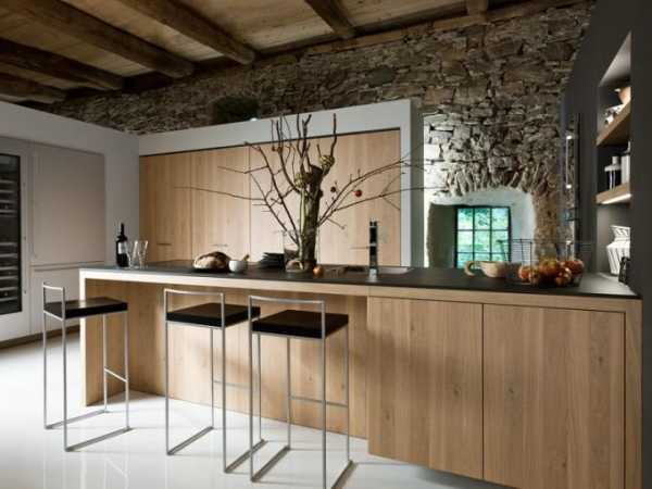 Натуральное дерево в любом интерьере всегда являлось признаком вкуса и стиля. Дерево экологично, приятно на ощупь, долговечно. Такая столешница требует к себе соответствующего ухода. Для увеличения срока службы и сохранения структуры дерева дерево покрывают специальным лаком. Барная стойка из дерева для кухни имеет только один недостаток — высокая стоимость.