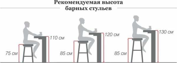Стандартные размерыНаличие стойки предполагает использование специальных барных стульев. Они тоже бывают разной высоты. И если для интерьера подобраны какие-то определенные стулья, то высота стойки будет зависеть от их высоты. Чтобы сидящий чувствовал себя комфортно, минимальное расстояние от колен до нижнего края столешницы должно быть не менее 10 см.