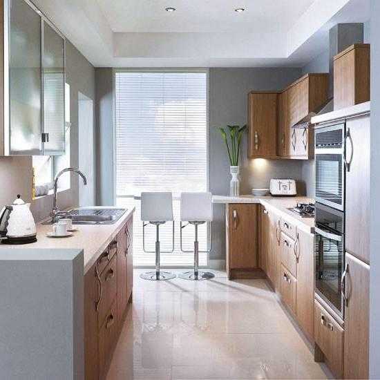 Линейное размещение обычно используется в пристенной конструкции. Столешница продолжает гарнитур. Она может быть расположена сразу после рабочей поверхности, чтобы увеличить рабочую зону, или как стол для приема пищи.