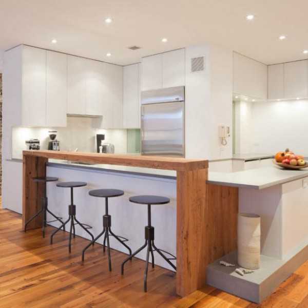 Саму барную стойку подобного типа можно разделить на две зоны: рабочую область, где хозяюшка воплощает в жизнь свои кулинарные задумки, и обеденную, где, собственно, и восседают голодные домочадцы в ожидании их завтрака. Вторую часть, как правило, слегка приподнимают, добиваясь тем самым эффекта «барной стойки».