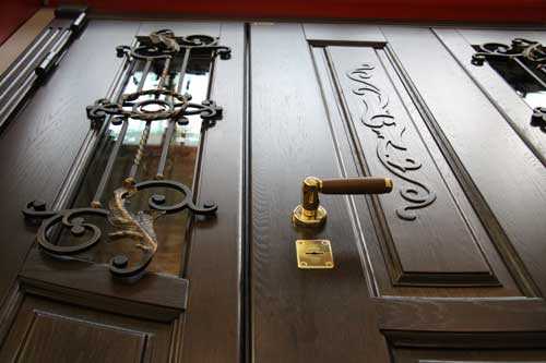 Важной особенностью двухстворчатых металлических дверей выступает присущий подобным конструкциям стильный и проработанный дизайн. Зачастую в нем присутствуют элементы ковки или зеркальные и стеклянные декоративные детали. В результате изделие становится важной и украшающей частью фасада офисного или общественного здания, а при установке в коттедже – загородного дома.