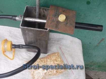 Засыпаем сухую стружку в камеру для горения, оставив зазор между дымоходом и стружкой примерно 5 см. Включаем компрессор и поджигаем стружку снизу. Если технология соблюдена правильно и стружка не отсыревшая, дым начинает вырабатываться сразу.