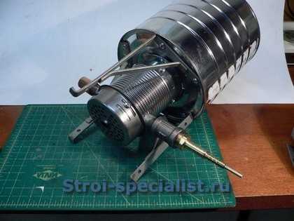 В соответствующее отверстия устанавливаем собранный ранее дымоход. При этом продолговатое отверстие, просверленное в стальной полудюймовой трубке, должно располагаться в центре меньшей банки.
