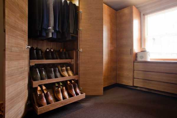 Специальные наклонные полки для обуви — очень удобный способ хранить туфли и ботинки. Увы, такие полки не слишком вместительны. Рациональнее разделить обувь на две части: ту, которая носится сейчас, и ту, которую надо хранить — сезонную, нарядную, для особенных случаев. На полках оставить необходимое, а остальное сложить в коробки и убрать в дальние углы шкафа.