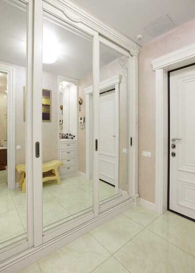 Если вы не любитель больших зеркальных поверхностей в интерьере (действительно, они не добавляют уюта) — сделайте зеркальными внутренние поверхности дверец. Правда, этот метод годится только для распашных конструкций. Две открытые дверцы с зеркалами внутри обеспечат эффект трюмо: вы сможете увидеть себя и спереди и сзади.