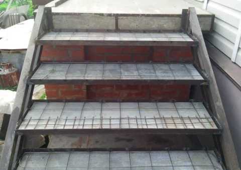 - Чтобы создать требуемый уклон, на крыльцо и ступени размещают металлическую сетку, можно рабицу. Диаметр прутка 4 мм. Сетку закрепляют дюбелями.