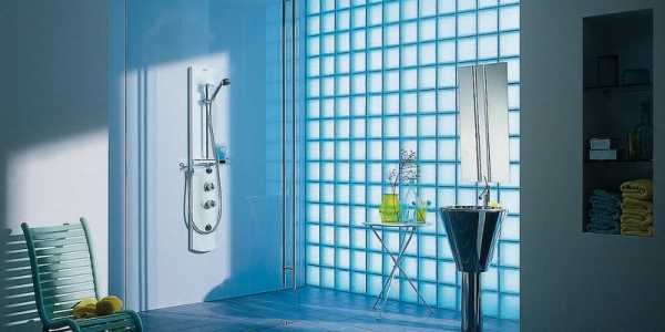 Если решено использовать стеклянные блоки для создания перегородок в ванной, лучше огораживать ими месторасположение старой купели, где уже подведены все коммуникации.