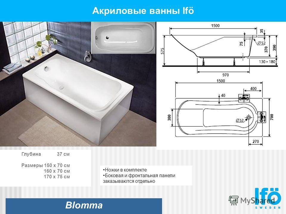 - Длина ванны стандартной модели из акрила бывает 120-190 см, а ширина 70-170 см. За счет глубины 65 см и более крутом углу расположения стенок изделия, объем емкости получается больше, чем у моделей из чугуна и стали.