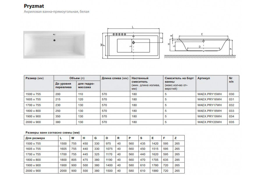 - Размеры акриловой ванны, с указанием вмещаемого объема воды
