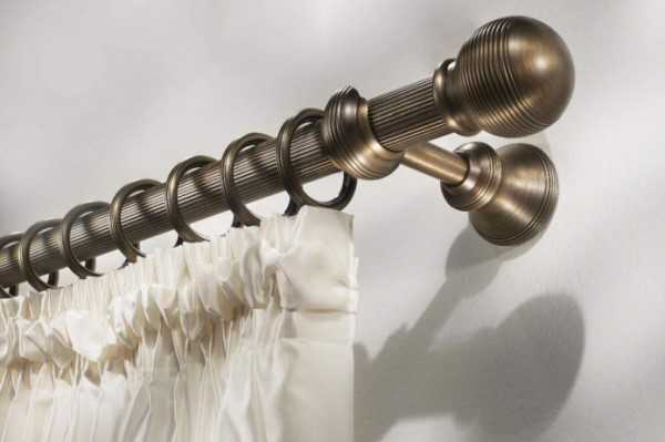 Это еще один традиционный вариант, имеющий округлые направляющие. Поверхность может быть выполнена как под золото, так и хром. Благодаря своей прочности металлические карнизы могут выдержать тяжесть гобеленного текстиля. Однако при желании их можно украсить более легкими шторами. Способ крепления – к стене или же сразу к потолку. В качестве фурнитуры могут быть использованы как кольца, так и крючки.