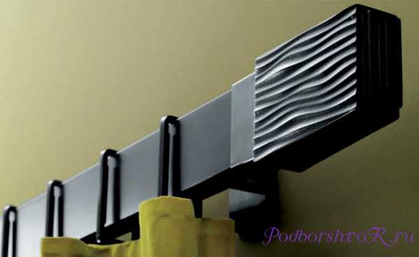 - профильные модели на кронштейнах, из пластика или алюминия, с крючками и кольцами, реже деревянные со специально встроенной алюминиевой тонкой направляющей – обычно в современном дизайне, украшенные кожей, стразами, инкрустацией;