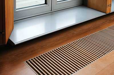 Существует еще одна разновидность конвекторов отопления, сильно отличающаяся от рассмотренных выше и потому стоящая особняком. Необычны они местом своей установки – в нише, расположенной ниже уровня пола. С большой долей вероятности встретить подобные отопительные приборы можно в помещениях торгового или офисного назначения с большими панорамными окнами, на фоне которых обычные радиаторы или конвекторы будут смотреться не совсем уместно. В коттеджах и квартирах такие конвекторы тоже устанавливают, но обычно лишь в тех случаях, когда нижний край окна расположен не выше 150-300 мм от уровня пола. Допускается встраивание отопительных конвекторов в подоконник.