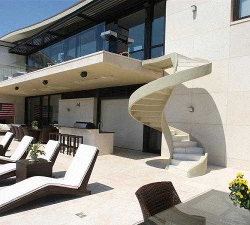 Для украшения боковых монолитных стенок бетонных маршевых конструкций часто используются плитка или керамогранит. Иногда лестницы наружные стационарные этой разновидности оформляются также с применением натурального камня. Обычно это или гранит, или мрамор. В очень дорогих домах отделка бетонных перил может производиться с использованием яшмы, змеевика, оникса и т.д.