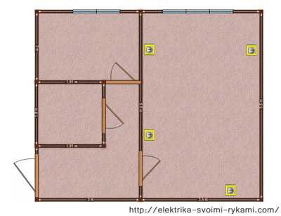 Точно также на первом чертеже (где техника и мебель), нарисуйте крестики жёлтым цветом в местах установки светильников, бра, торшеров, люстр. Здесь вам удобно будет увидеть – где кровать, там значит прикроватный светильник; где диван или кресла, значит бра, под которым можно почитать и т.д. Затем перенесите все эти лампочки на электрическую схему. Заодно продумайте и отметьте места установки выключателей. Мысленно представьте себе, в какую сторону у вас будут открываться межкомнатные двери, чтобы потом выключатели не оказались за ними.