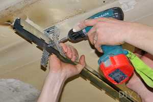 На существующем потолке произведите разметку мест крепления подвесов в соответствии с эскизом ванной. Пристенный уголок крепят дюбель-гвоздями 6 х 40 мм с шагом 300-400 мм. Для этого с помощью карандаша и рулетки на уголке делают отметки. По отметкам высверливают отверстия.