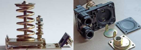 - две пружины разного диаметра, посредством которых выставляется уровень наибольшего и минимального давления, при котором устройство должно срабатывать.