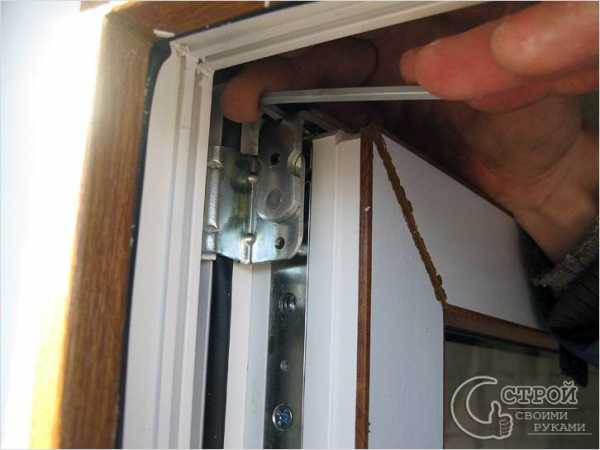 Для этого в верхнем углу со стороны ручки и в нижнем со стороны петель требуется распереть стеклопакет с боков. Можно вставить листовой пластик или линолеум, что-нибудь неметаллическое. Верхний угол со стороны петель и нижний со стороны ручки расклиниваются сверху и снизу соответственно.