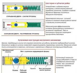 Основной рабочей деталью этого приспособления является пружина и масляный амортизатор, который отвечает за плавное закрытие двери. Через специальную систему клапанов масляная жидкость, в зависимости от направления, во время работы перетекает из одной камеры в другую.