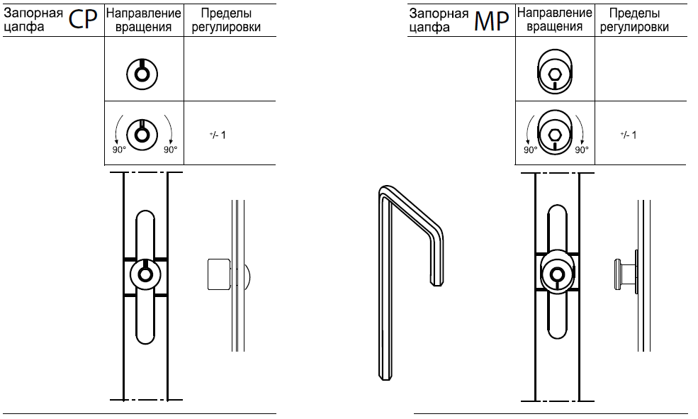 Поворот цапфы изменяет усилие прижима створки, делая его сильнее или слабее. Если отметка направлена в сторону помещения, прижим усиливается. Если на улицу — ослабляется.