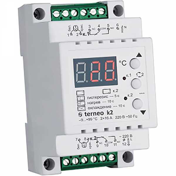 Терморегулятор terneo rk предназначен для управления электрическими котлами с потребляемой мощностью до 7000 ВА и усовершенствования процесса работы котельных агрегатов прошлых лет выпуска. Допустимые границы по температуре воды у него составляют (–55)…(+125) ºС. Текущая температура воды и сообщения системы отражаются на цифровом экране. Есть один светодиодный индикатор, сигнализирующий о включении нагревательных элементов котла. Настройку работы, а также навигацию по меню терморегулятора упрощает наличие трех клавиш. Заданные параметры эксплуатации электрического котла надежно сохраняются при помощи энергонезависимого модуля памяти.