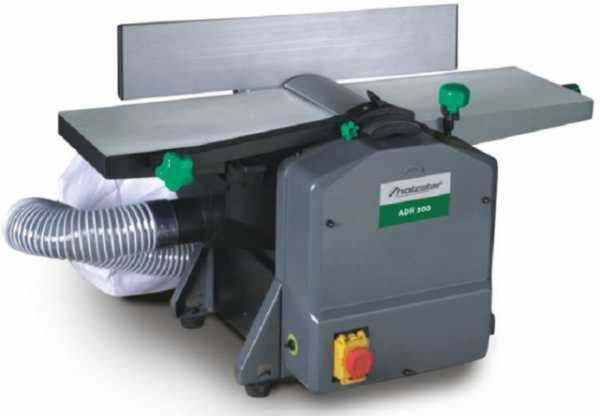 Первое место рейтинга отдано немецкой модели с двумя двухсторонними ножами и возможностью строгания максимальной ширины 330 мм. Рейсмусовый агрегат оснащен двигателем на 1800 Вт и вращает вал со скоростью 9800 об/мин. За один раз с древесины снимается сразу 3 мм. Механизм подачи тянет заготовку со скоростью 7 м в минуту. Для поддержания длинной доски используется откидная станина. Для обработки ребра получится завести изделие 15.2 см по высоте. Удаление опилок происходит через аспирационное отверстие, диаметром 10 см. К нему можно подключить пылесос для поддержания чистоты в мастерской. Все опасные части размещены глубоко в станке, поэтому оператору ничего не угрожает. Определить высоту устанавливаемого размера помогает шкала с узким точным указателем. Чтобы значения не сбились от вибрации, предусмотрен блокиратор.