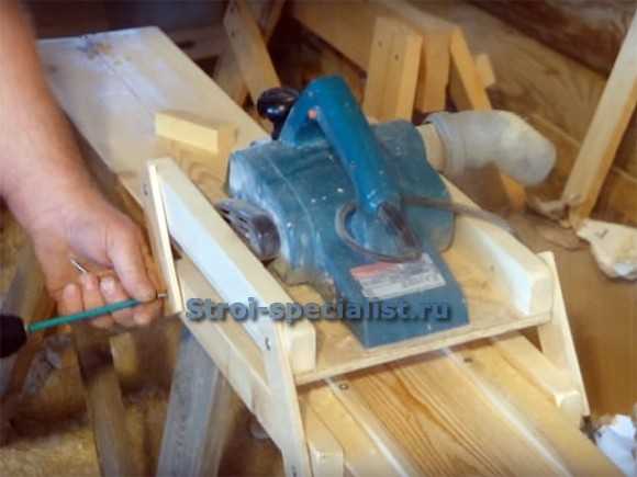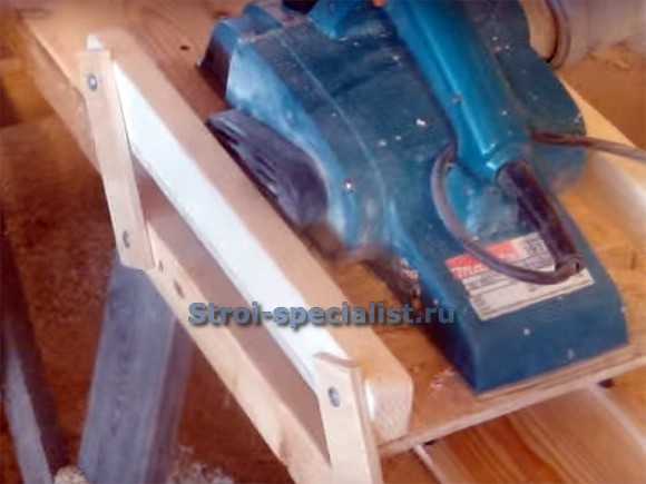 Очевидно, что такую же систему можно использовать и при обработке погонажного материала, а не только широких и коротких заготовок, но при этом, в отличие от рейсмусового станка и предыдущего варианта использования электрорубанка в его качестве, вы будете двигать не заготовку, а самостоятельно передвигаться вдоль нее.