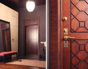 А вот для их установки при входе в помещение чаще всего выбирают изделие с наличием декоративных вставок и фурнитуры. Такая дверь может иметь разную отделку, например: