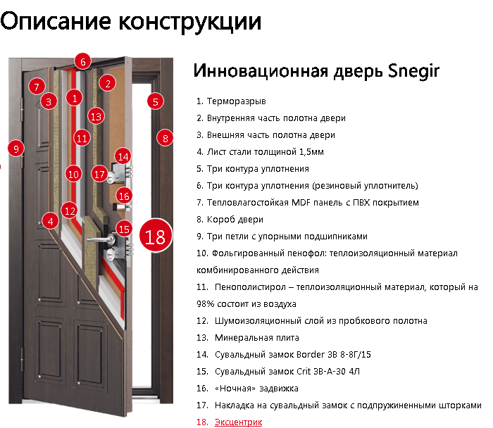 ΠΡΠΌΠ΅ΡΠ°Π΅ΡΡΡ, ΡΡΠΎ Π΄Π²Π΅ΡΠ½Π°Ρ ΠΊΠΎΡΠΎΠ±ΠΊΠ° Ρ ΠΈΠ·Π΄Π΅Π»ΠΈΠΉ ΠΎΡΠ΅Π½Ρ ΠΏΡΠΎΡΠ½Π°Ρ, Π° Π΄Π²Π΅ΡΠ½ΠΎΠ΅ ΠΏΠΎΠ»ΠΎΡΠ½ΠΎ ΡΡΠΈΠ»Π΅Π½ΠΎ ΠΌΠΎΡΠ½ΡΠΌΠΈ ΡΠ΅Π±ΡΠ°ΠΌΠΈ ΠΆΠ΅ΡΡΠΊΠΎΡΡΠΈ. Π’Π°ΠΊΠΆΠ΅ Π΄Π»Ρ ΠΎΠ±Π΅ΡΠΏΠ΅ΡΠ΅Π½ΠΈΡ Π±Π΅Π·ΠΎΠΏΠ°ΡΠ½ΠΎΡΡΠΈ Π΅ΡΡΡ ΡΡΠΈΠ»Π΅Π½Π½ΡΠ΅ ΠΈΠ»ΠΈ ΡΠΊΡΡΡΡΠ΅ ΠΏΠ΅ΡΠ»ΠΈ, Π° Π²ΡΠ΅ Π²Π°ΠΆΠ½ΡΠ΅ ΡΡΠ°ΡΡΠΊΠΈ Π΄ΠΎΠΏΠΎΠ»Π½ΠΈΡΠ΅Π»ΡΠ½ΠΎ Π·Π°Π±ΡΠΎΠ½ΠΈΡΠΎΠ²Π°Π½Ρ. Π£ΠΏΠ»ΠΎΡΠ½ΠΈΡΠ΅Π»Ρ Π² 2-3 ΠΊΠΎΠ½ΡΡΡΠ° ΠΏΠΎΠ·Π²ΠΎΠ»ΡΠ΅Ρ Π½Π΅ Π±ΠΎΡΡΡΡΡ ΡΡΠ΅ΡΠΊΠΈ ΡΠ΅ΠΏΠ»Π°. Π‘Π½Π°ΡΡΠΆΠΈ Π΄Π²Π΅ΡΠΈ ΠΏΠΎΠΊΡΠ°ΡΠ΅Π½Ρ ΠΏΠΎΡΠΎΡΠΊΠΎΠ²ΠΎΠΉ ΠΊΡΠ°ΡΠΊΠΎΠΉ, ΠΊΠΎΡΠΎΡΠ°Ρ Π΄ΠΎΡΡΠ°ΡΠΎΡΠ½ΠΎ Ρ ΠΎΡΠΎΡΠΎ Π΄Π΅ΡΠΆΠΈΡΡΡ. Π ΠΈΠ·Π½ΡΡΡΠΈ ΡΡΡΠ°Π½ΠΎΠ²Π»Π΅Π½Ρ Π΄Π΅ΠΊΠΎΡΠ°ΡΠΈΠ²Π½ΡΠ΅ ΠΏΠ°Π½Π΅Π»ΠΈ.