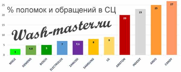 Следующие марки, которые мы выделили — LG и Samsung (достаточно неплохие Корейские модели за приемлемую стоимость), широкий модельный ряд, большой выбор. Этим маркам отдаем 6 и 7 место в нашем рейтинге. Количество поломок 8-9%. 8, 9 и 10 места занимают «итальянцы» (в настоящее время собирающиеся в России): Ariston, Ardo, Indesit – 20, 25 и 23 % соответственно. По какой причине разрыв между шестым и седьмым местами составил более одиннадцати процентов? Можно лишь предположить, что сборка этих стиральных машин производится некачественно, а что говорить о нашей российской сборке, так она вообще не предсказуемая. Детали, используемые при сборке, не блещут качеством, именно поэтому, большинство агрегатов гибнут в первые 3-4 года после покупки, но процентов 20-30 вполне могут дотянуть до 8, а, то и 10 лет.
