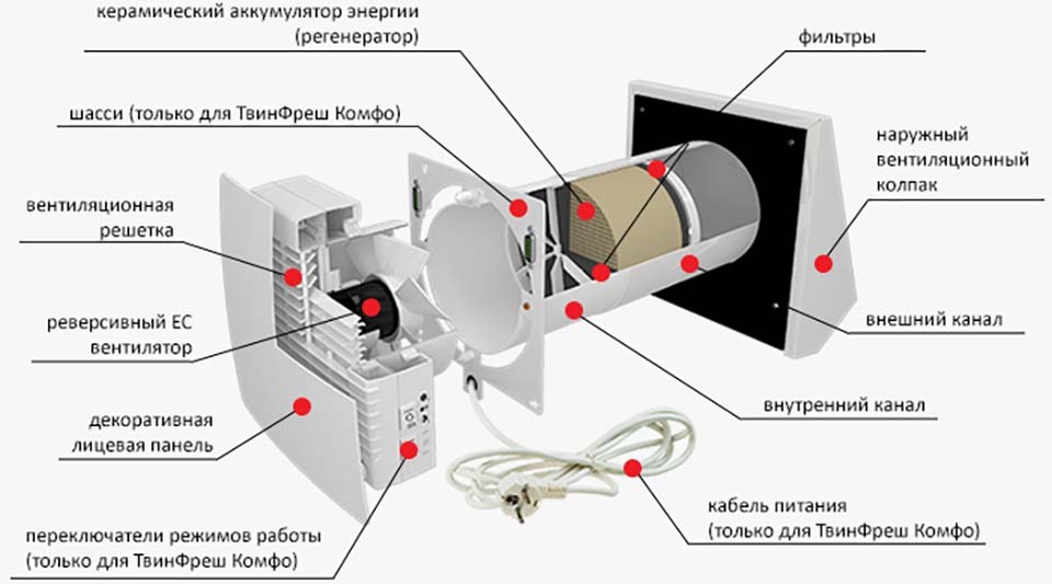 Принцип работы максимально прост, но элегантен. Вход свежего воздуха и выход отработанного происходит поочередно через теплообменник, который усредняет их температуру.