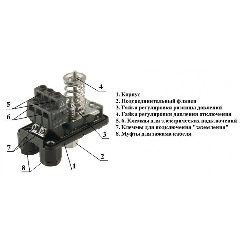 Реле давления РМ-5 — устройство, включающее и выключающее насос при определенных уровнях давления, основной элемент управления работой насоса.