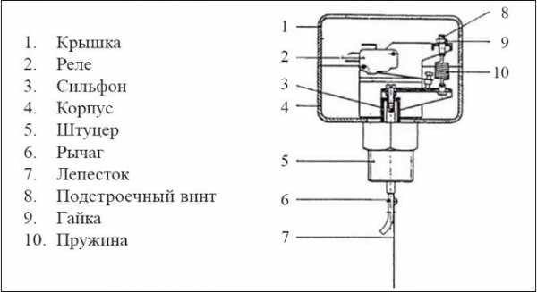 Состоит реле из мембраны, которая реагирует на давление и контактной группы, которая в нормальном состоянии разомкнута. При понижении давления мембрана давит на контакты, они замыкаются, отключая питание.
