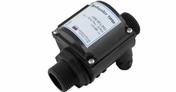 Турбинные датчики потока устроены несколько сложнее. Основа устройства — небольшая турбина с электромагнитом в роторе. При наличии потока воды или газа турбина вращается, создается электромагнитное поле, которое преобразуется в электромагнитные импульсы, считываемые датчиком. Этот датчик, в зависимости от количества импульсов, включает/отключает питание насоса.