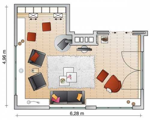 Решая вопросы проектирования, начните с зонирования. Возьмите чертеж гостиной и отметьте участки, связанные с разными процессами в ней. Например: прием гостей, просмотр телевизора, занятия хобби и рукоделием, игровая зона для детей.