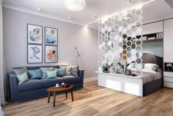 Отделение спальной зоны происходит по-другому. Разграничителем станет тонкая декоративная перегородка или разделяющие элементы интерьера – панно, зеркало, картины или фотографии. Идеально подойдет молодым людям, которые ведут свободный образ жизни.