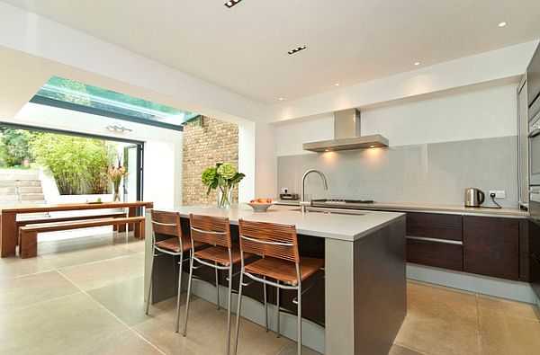 Современный ремонт с островом в качестве обеденного стола