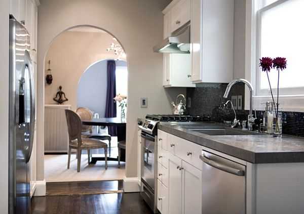 Обеденный стол лучше выбрать овальной формы и небольшого размера, либо и вовсе перенести его в другую комнату. Двери можно убрать или заменить на выдвижные, в том случае, если у вас есть мощная вытяжка.